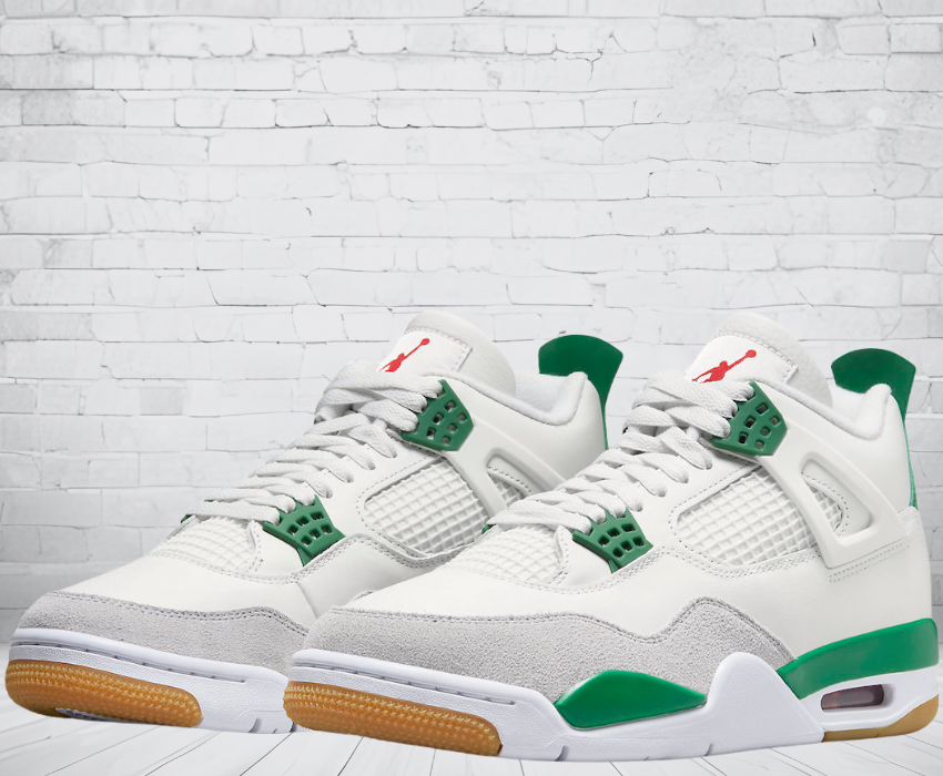 La collaborazione tra Nike SB e Jordan ha dato vita alle Jordan 4 Retro SB Pine Green, unendo il mondo dello skatepark e del basket. Queste sneakers presentano una tomaia in pelle bianca con un mudguard in pelle scamosciata grigio neutro. L'intersuola bianca e verde pino, con una Air Unit rossa, aggiunge un tocco distintivo. La suola in gomma speciale offre un'aderenza ottimale per lo skateboard.
